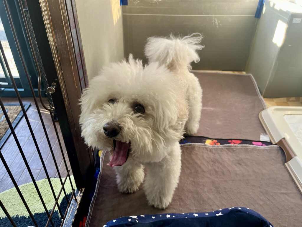 ビションプーくんは最初は緊張している様子でしたが、スタッフにはすぐにすっかり慣れてくれました💖ほかのワンちゃんは苦手なようで、毎日遠巻きに…👀